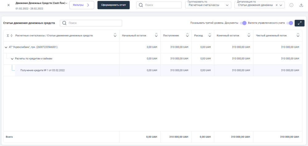 В отчете мы можем увидеть на какой счет/кассу поступили кредитные средства, а также их сумма и документ, которым они были получены.
