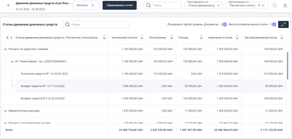 После создания документа "Возврат кредита" данные из него попадают в отчет — Движение денежных средств.