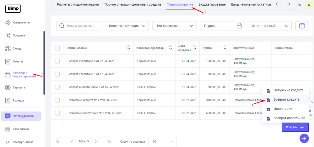 На сервисе Bimp, для того, чтобы зафиксировать возврат кредитных средств, необходимо создать документ "Возврат кредита".