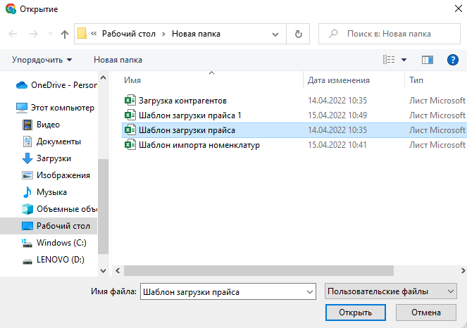 После нажатия кнопки, перед нами открывается окно нашего компьютера, где необходимо выбрать заполненный ранее шаблон, и нажать на кнопку "Открыть".