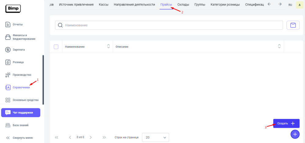На сервисе Bimp, возможно вносить прайсы, для реализации товаров/услуг нашей компании, с помощью блока Справочники раздел Прайсы. Данный раздел мы можем заполнять вручную или с помощью шаблона в формате Excel.