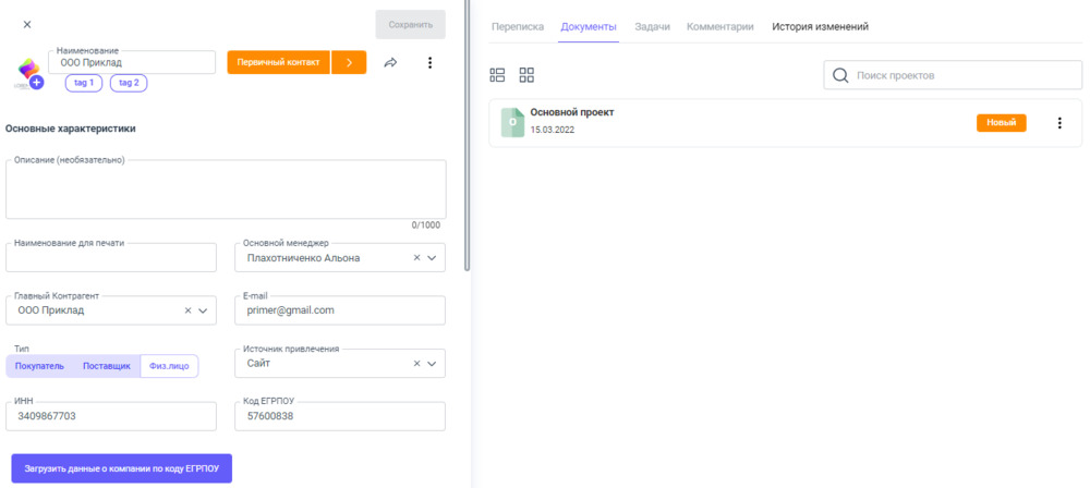 Левое рабочее поле — то, что мы заполняли в блоке Справочники раздел Контрагенты и физлица, а правое рабочее поле — то поле, которое отображает Проекты на основе которых ваша компания сотрудничает с данным контрагентом.