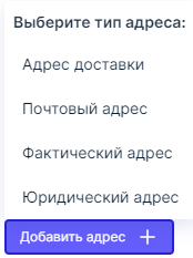 11. На рабочем поле Адреса после нажатия кнопки "Добавить адрес" из выпадающего списка выбираем какой именно адрес мы хотим внести в карточку контрагента.