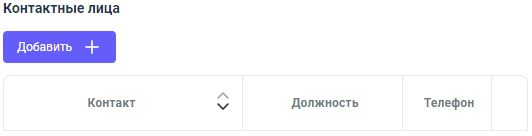 10. На рабочем поле Контактные лица карточки в соответствующих столбцах прописываем — ФИО контакта контрагента, должность контакта и мобильный телефон контактного лица, с помощью нажатия кнопки "Добавить".