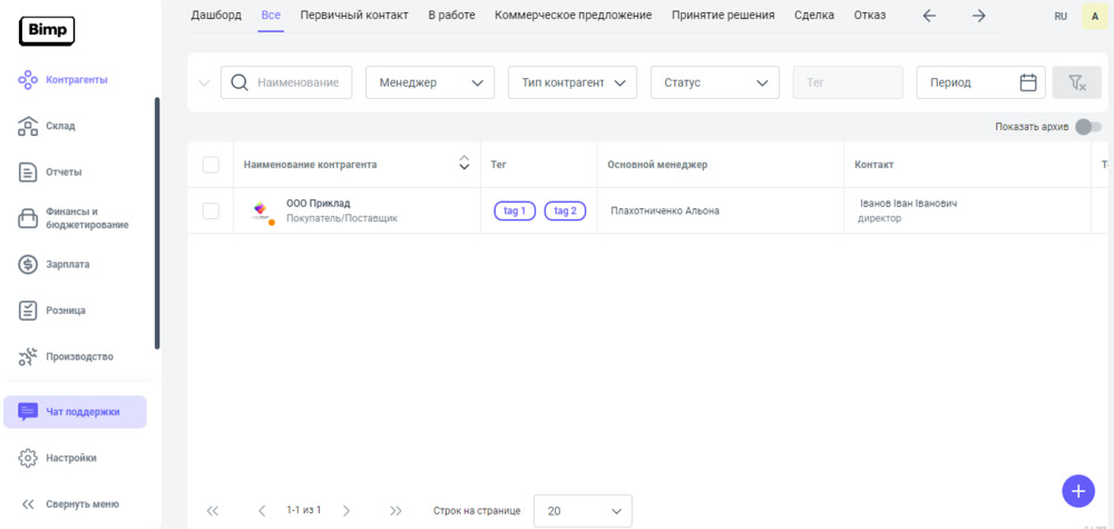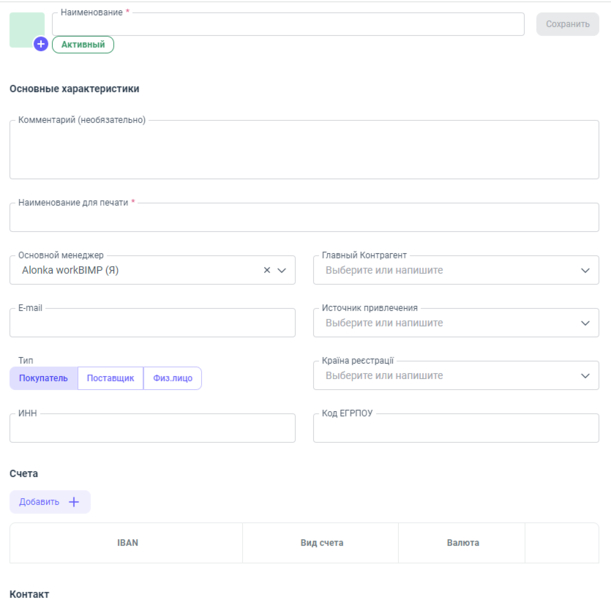 2. Общий вид карточки контрагента, при открытии её в блоке Контрагенты. Карточка имеет два рабочих поля.