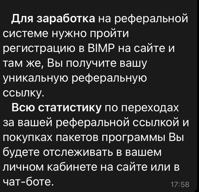 Кнопка "Реферальная" - информирует о реферальной системе нашего сервиса Bimp;