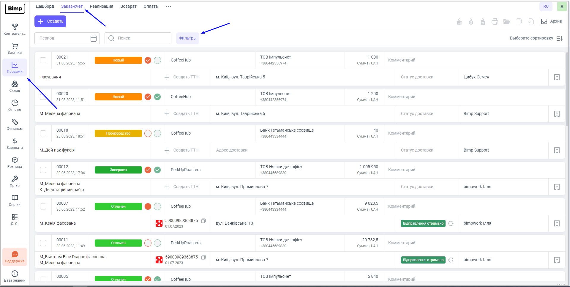 На сервисе Bimp, есть возможность просматривать стадию взаиморасчетов с контрагентами с помощью статусов в документе заказ-счет, на основе которого происходит взаимодействие с ними.