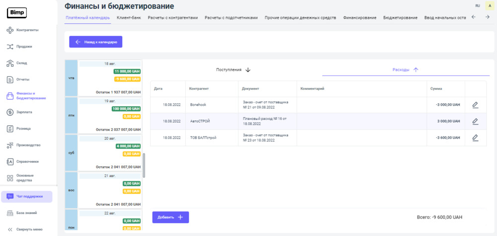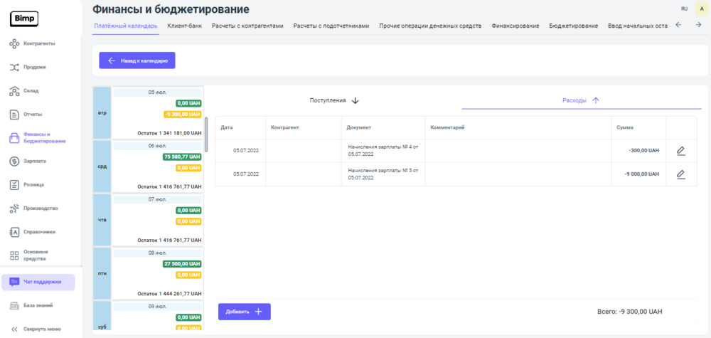 С помощью календаря мы можем отследить запланированные оплаты от поставщиков, а также наши планы на оплаты покупателям и выплату заработной платы сотрудникам.