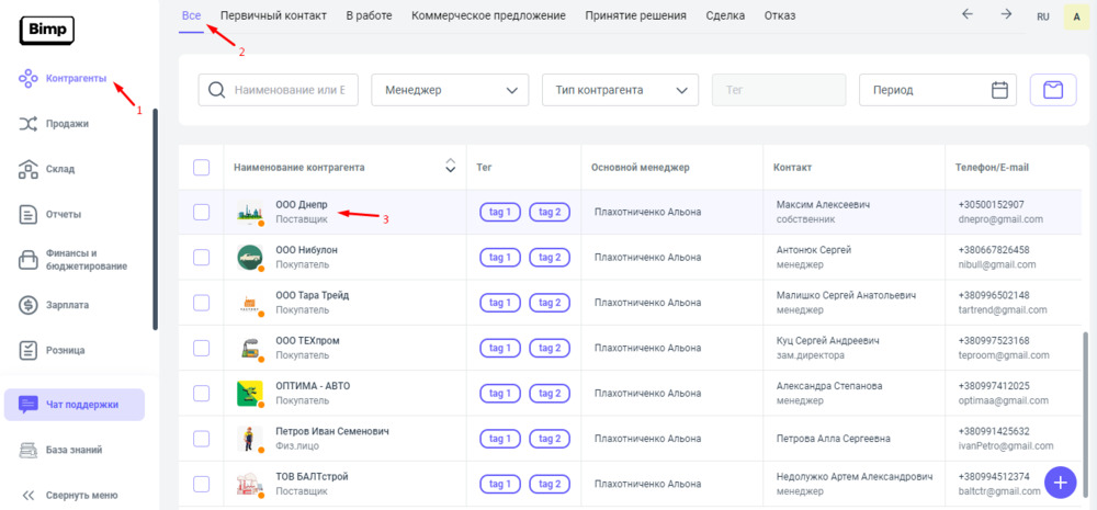 Документ "Возврат денежных средств от поставщика" вы можете создать в блоке Контрагенты выбрав карту необходимого контрагента с типом — поставщик.