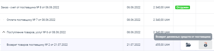 И уже, на основе документа - "Оплата поставщику" или "Возврат товара поставщику" вы можете оформить документ "Возврат денежных средств от поставщика" = вернуть на расчетный счет/кассу компании денежные средства от поставщика.