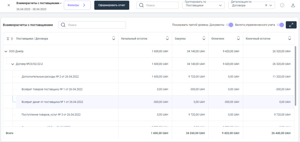 После создания документа "Возврат денежных средств от поставщика", данные из него попадают в отчет — Взаиморасчеты с поставщиками.
