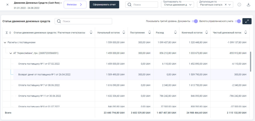 В отчете мы можем увидеть по какому контрагенту и на какую сумму вернулись денежные средства, а также возвращены ли по нему товары нашему поставщику.