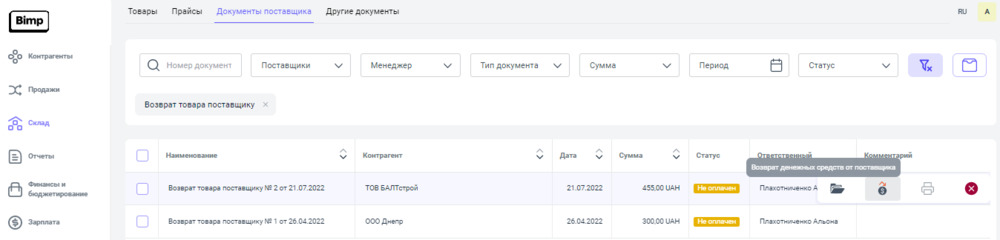 с помощью панели виджетов в строке необходимого документа "Возврат товара поставщику" в блоке Склад раздел Документы поставщика.
