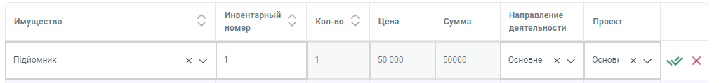 Внести изменения, возможно в столбцы - Имущество, Инвентарный номер, Направление деятельности и Проект.