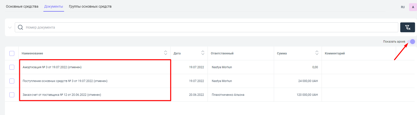Для того чтобы посмотреть, какие документы были Отмени, необходимо переключить переключатель , после чего мы увидим весь список Отменённых ранее документов.
