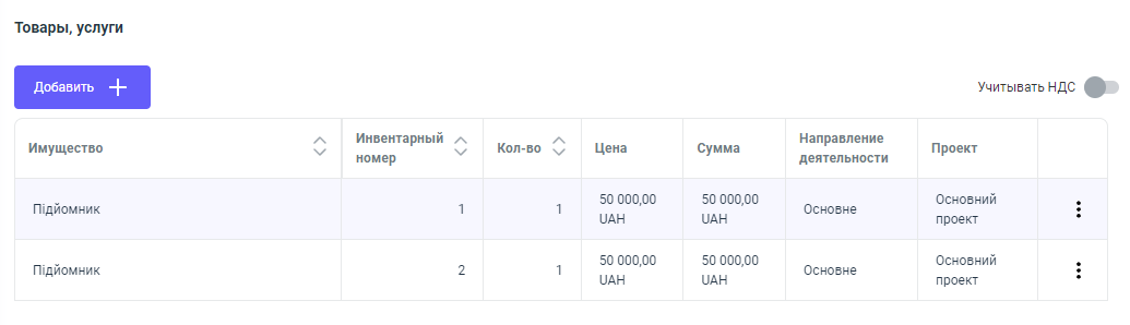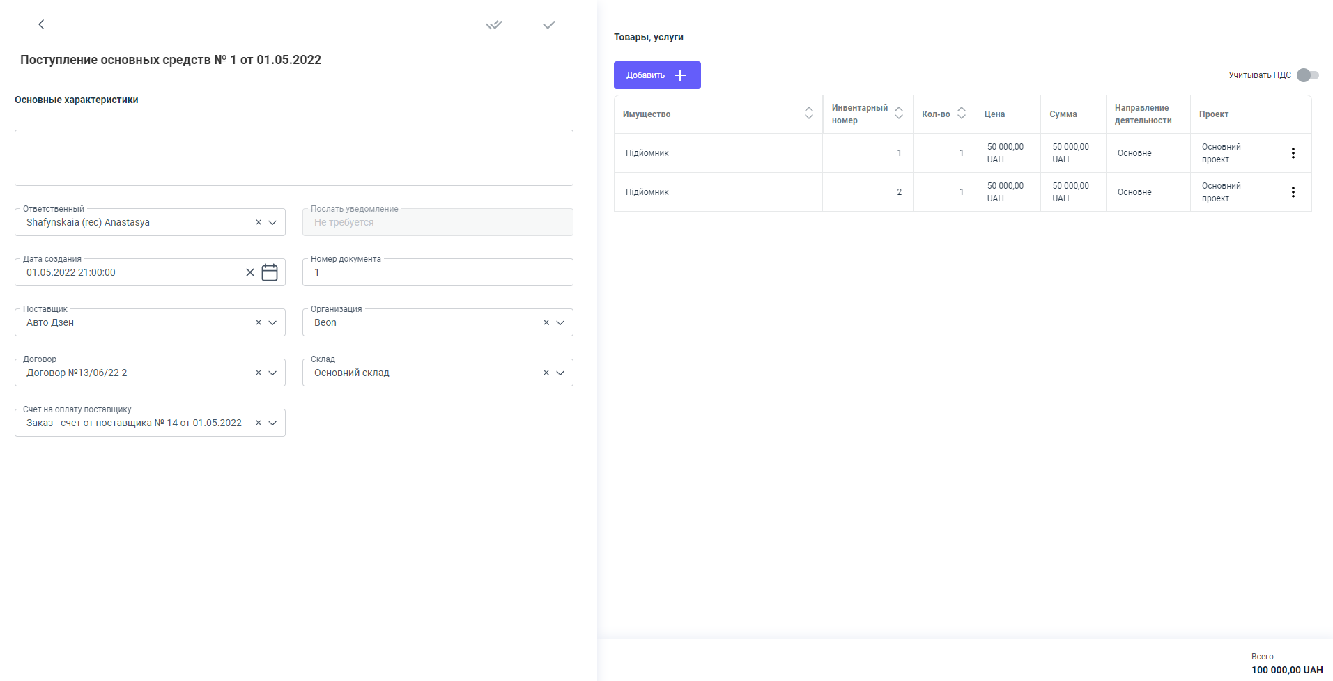 Данный документ можно создать через блок Основные средства раздел Документы, а также через блок Контрагенты ➞ Карточка контрагента.