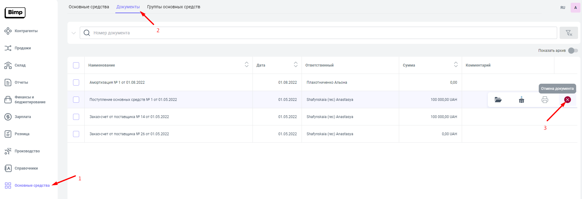 8. Так же в данном блоке Основные Средства, есть возможность Отменять проведения документов.