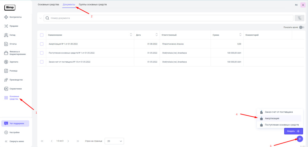 1. Переходим в блок Основные средства раздел Документы, и нажимаем кнопку "Создать" выбрав строку Амортизация