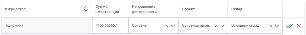 Также, вы можете внести измениия, не только в показатели столбца Сумма амортизации, а также в столбцы - Направление деятельности, Проект и Склад.
