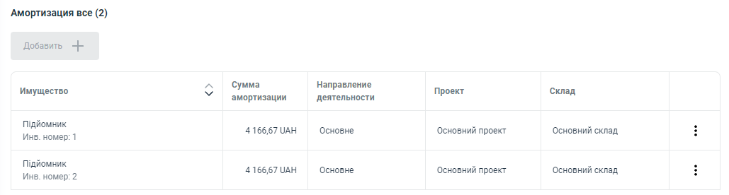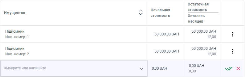 В столбце Сумма амортизации - программа, автоматически проставляет суммы амортизации по каждому основному средству, но вы можете изменить её с помощью нажатия кнопки "Три точки" в строке необходимого ОС.