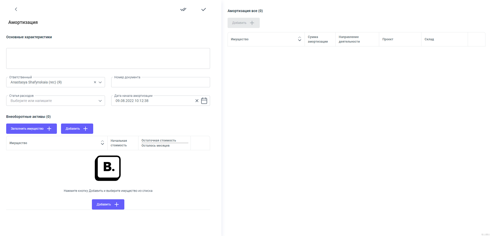 При нажатии кнопки "Заполнить имущество +" - в документ подтягиваются все основные средства,по которым необходимо провести амортизацию (со всех документов компании).