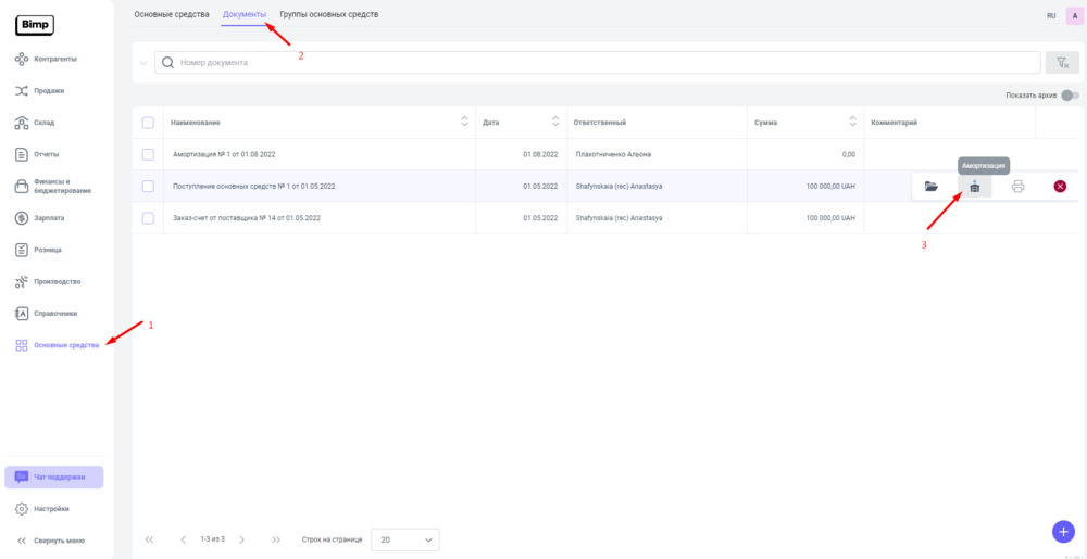 или наводим курсор мышки на необходимый нам документ "Поступление основных средств" и на всплывающей панели с правой стороны, нажимаем на виджет "Амортизация".
