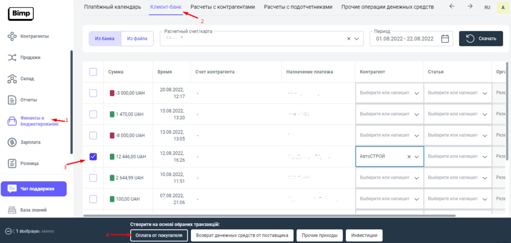1. Переходим в блок Финансы и бюджетирование раздел Клиент-банк, загружаем выписку с необходимого нам банка, и подвязываем оплату на документ "Оплата от покупателя".