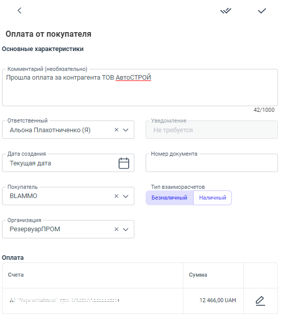 4. После проведения документа об возврате, переходим в карточку покупателя, оплату по которому внес другой покупатель, и создаем документ "Оплата от покупателя" и проводим оплату с прогоночного счета компании.