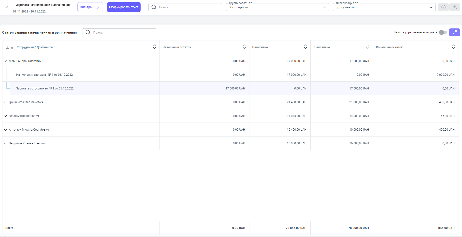 После выплаты зарплаты данным документом, в отчете мы можем увидеть какому сотруднику, и какая сумма была выплачена и название документа (его номер и дата создания).