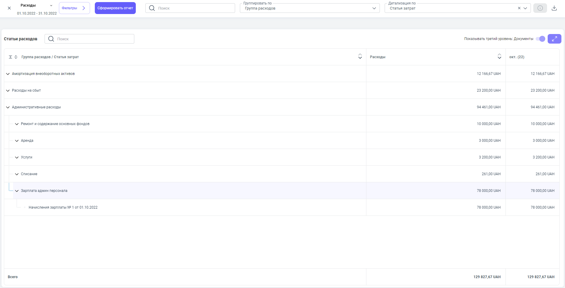 Данные с документа попадают в отчет — Расходы.
