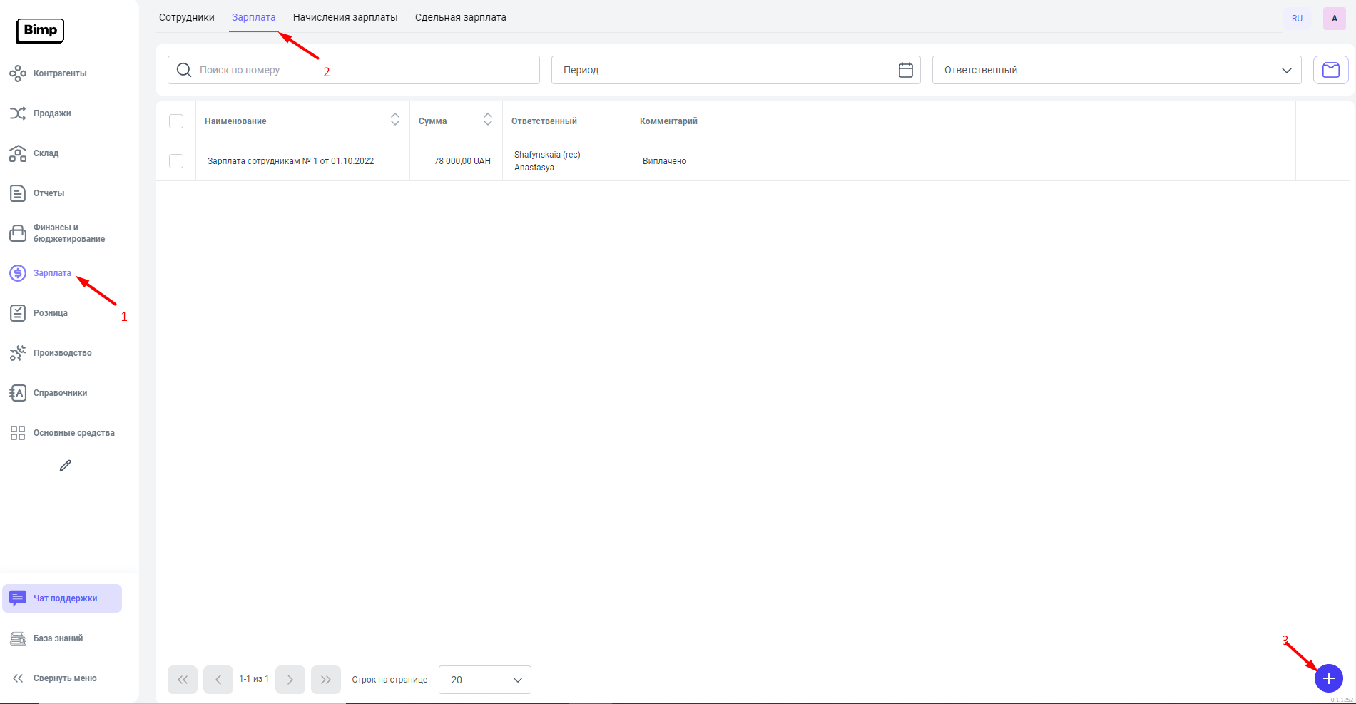 На сервисе Bimp, для того чтобы выплатить зарплату сотрудникам, необходимо воспользоваться документом "Зарплата".