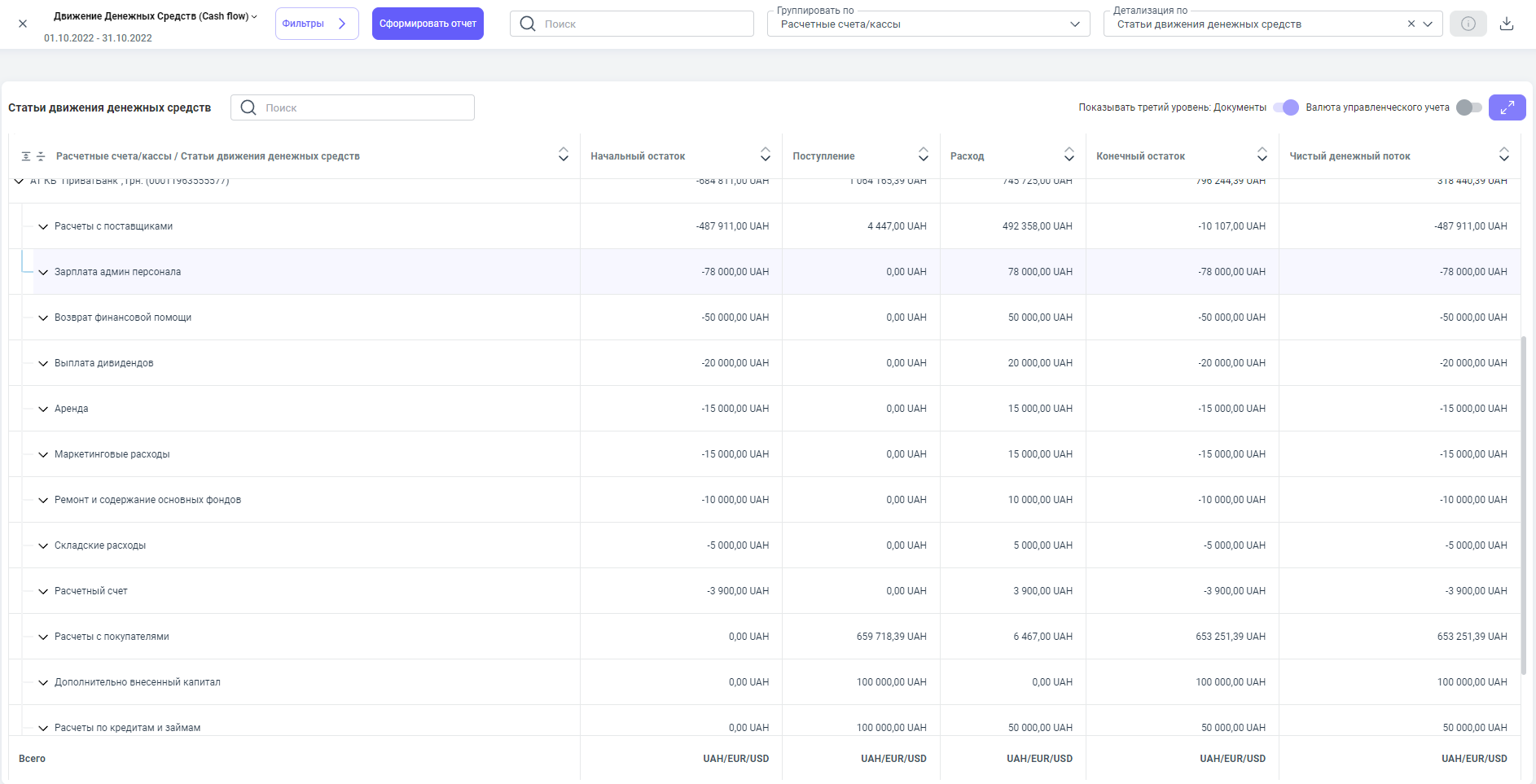 А также, данные с этого документа попадают в отчет — Движение денежных средств.