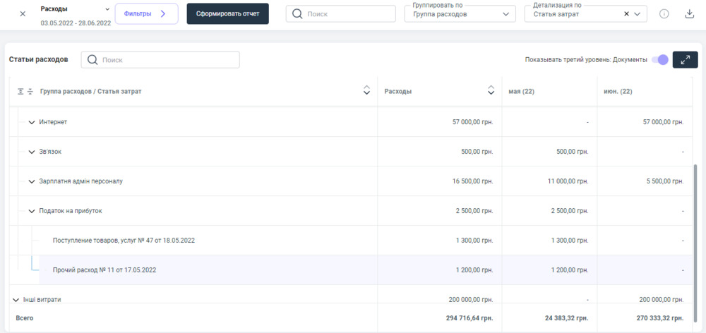 Также, данные с документа попадают в отчет — Расходы.