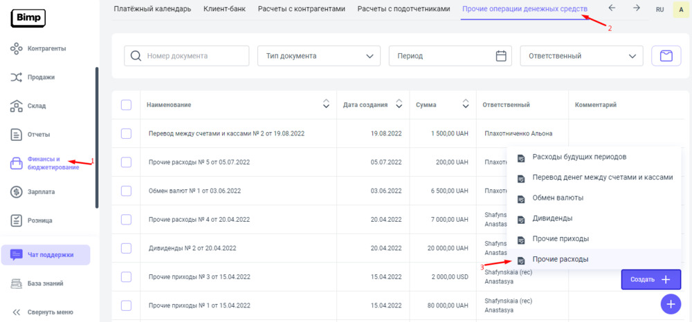 Документ "Прочие расходы" вы можете создать в блоке Финансы и бюджетирование раздел Прочие операции денежных средств, нажав на кнопку "Создать" и выбрав строку Прочие расходы.