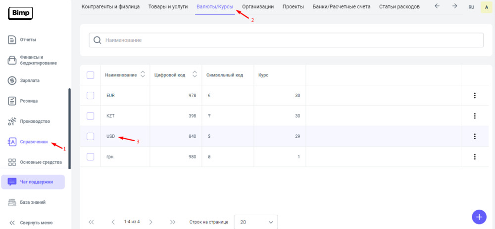 1. Переходим в блок Справочники раздел Валюты/Курсы,