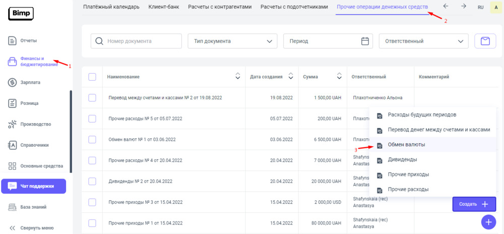 3. Потом, проводим обмен валюты в блоке Финансы и бюджетирование разделе Прочие операции денежных средств, с помощью документа "Обмен валюты".