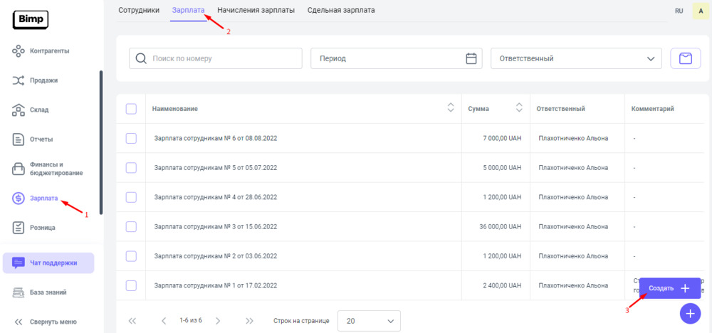 4. После обмена валюты, создаем документ "Зарплата", чтобы выплатить заработную плату сотрудникам компании.