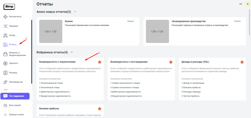 1. Необходимо, перейти в блок Отчеты и выбрать необходимый отчет со списка.