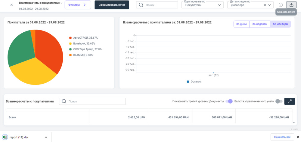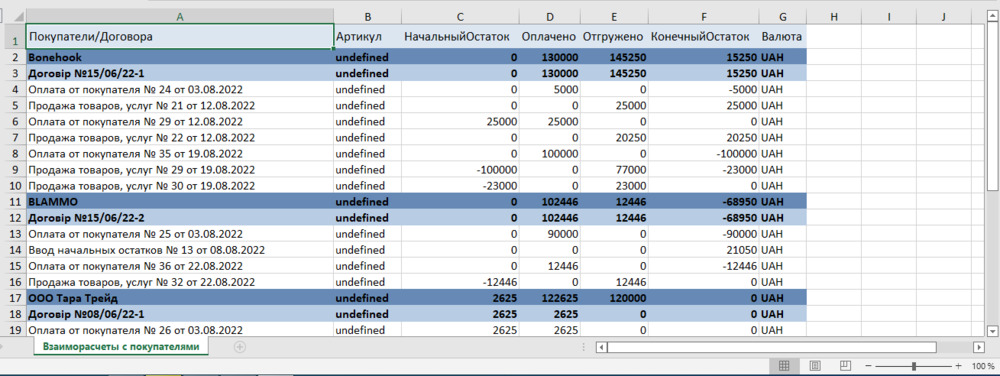 Данные в файле имеют приблизительно такой вид (на скриншоте, взято за пример информацию с отчета — Взаиморасчеты с покупателями).