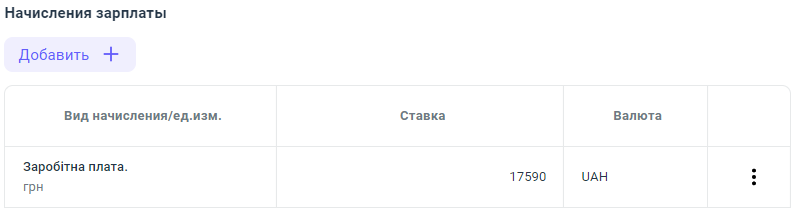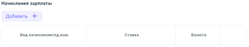 8. В нижнем поле Начисления зарплаты отображаются данные по зарплате. В столбце Вид начисления - мы выбираем необходимый пункт (с выпадающего списка) по данному сотруднику. В столбце Ставка - вносим денежную сумму начисления. В столбце Валюта - указываем валюту выплаты.