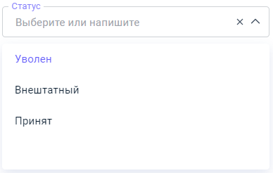 5. Строка Статус - из выпадающего списка, выбираем в каком статусе находится данный сотрудник в нашей компании.