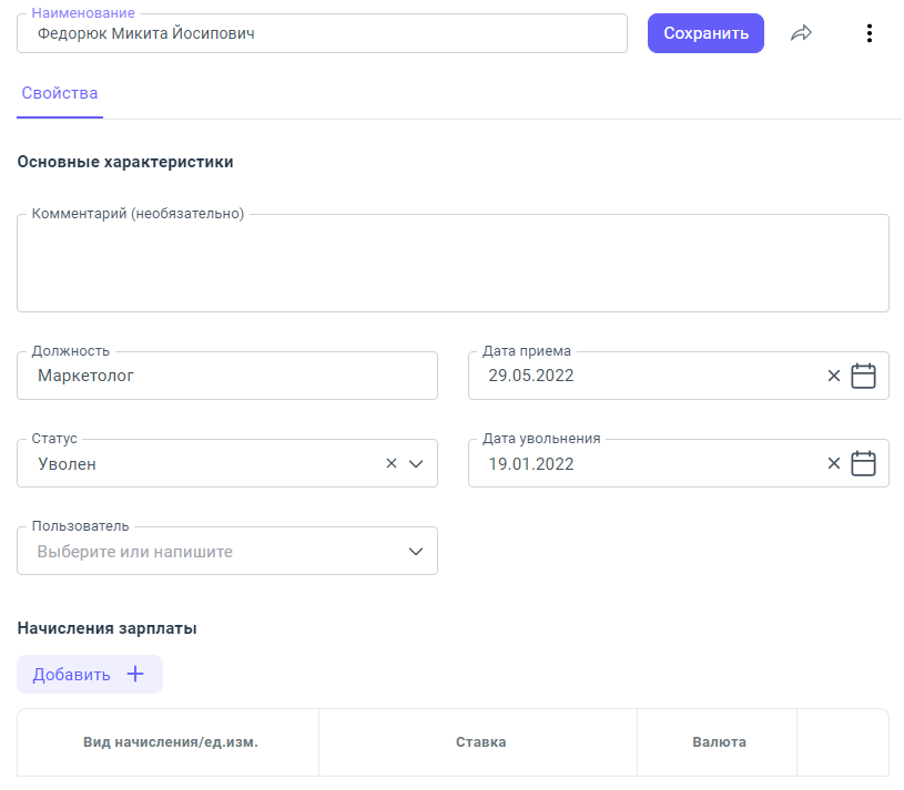 9. После внесения всех данных в карточку сотрудника, нажимаем на кнопку "Сохранить