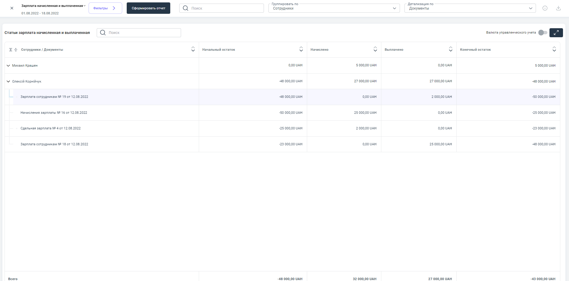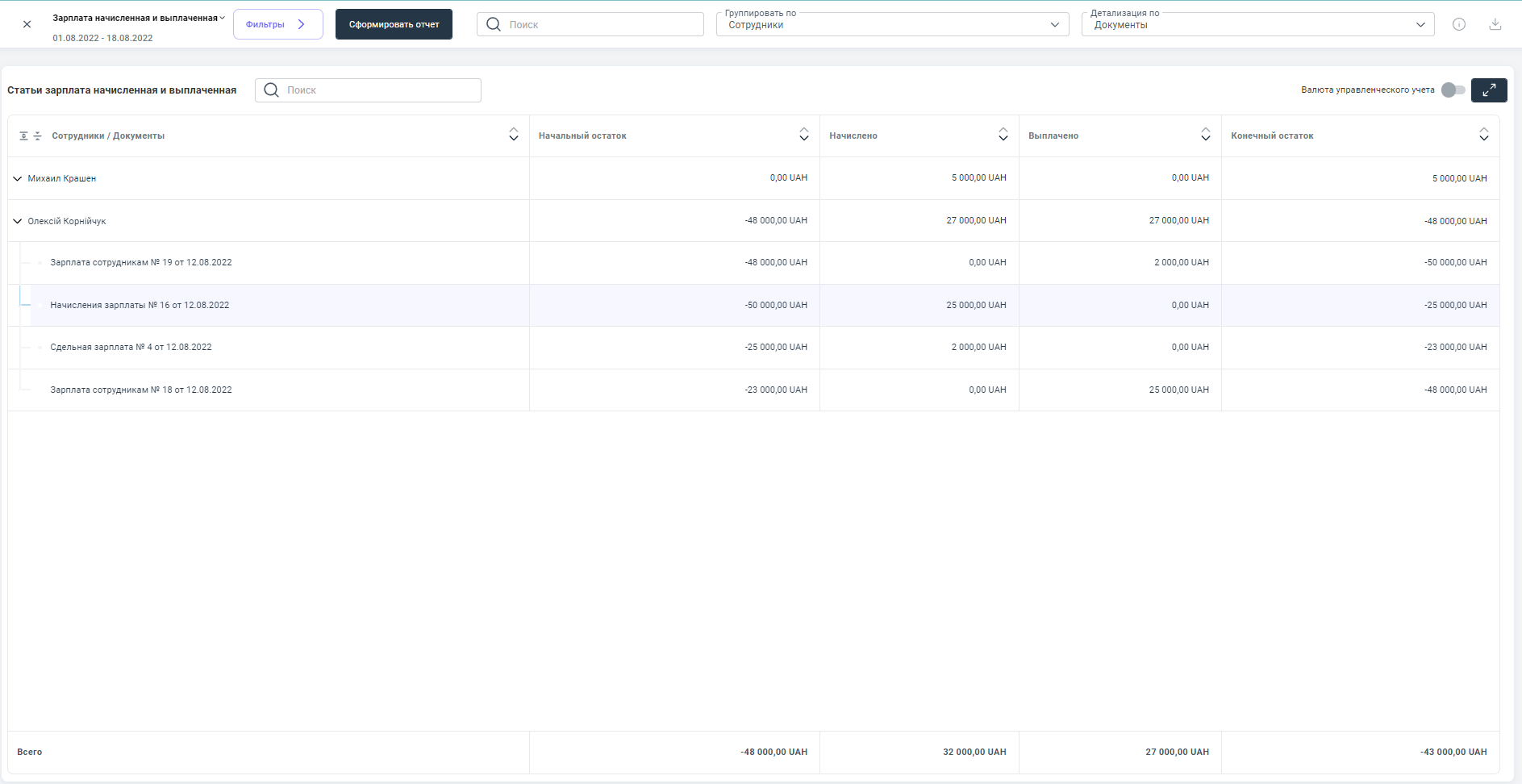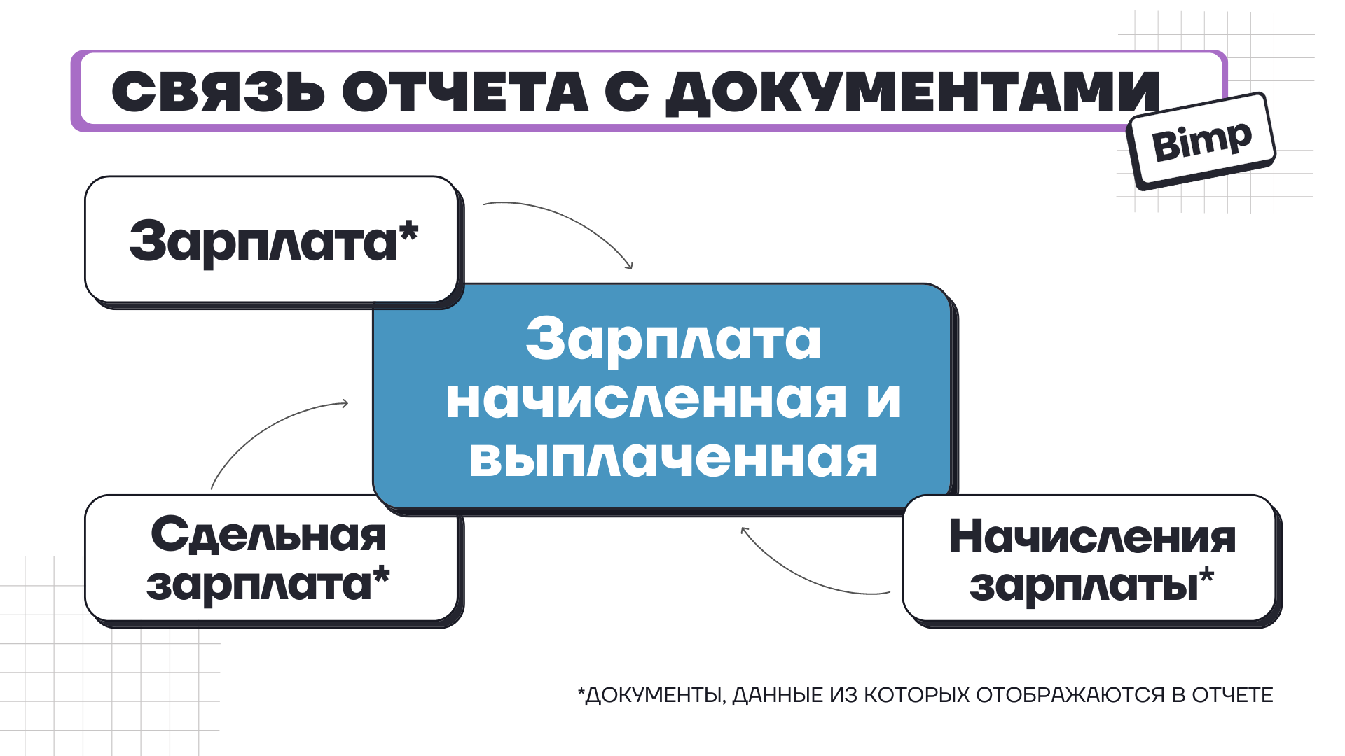 Отображение документа "Начисления зарплаты" в отчете ⮯