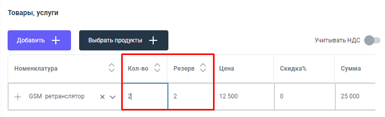 В столбце Кол-во - указываем, запланированное к реализации количество единиц, и автоматически это количество дублируется в столбец Резерв.