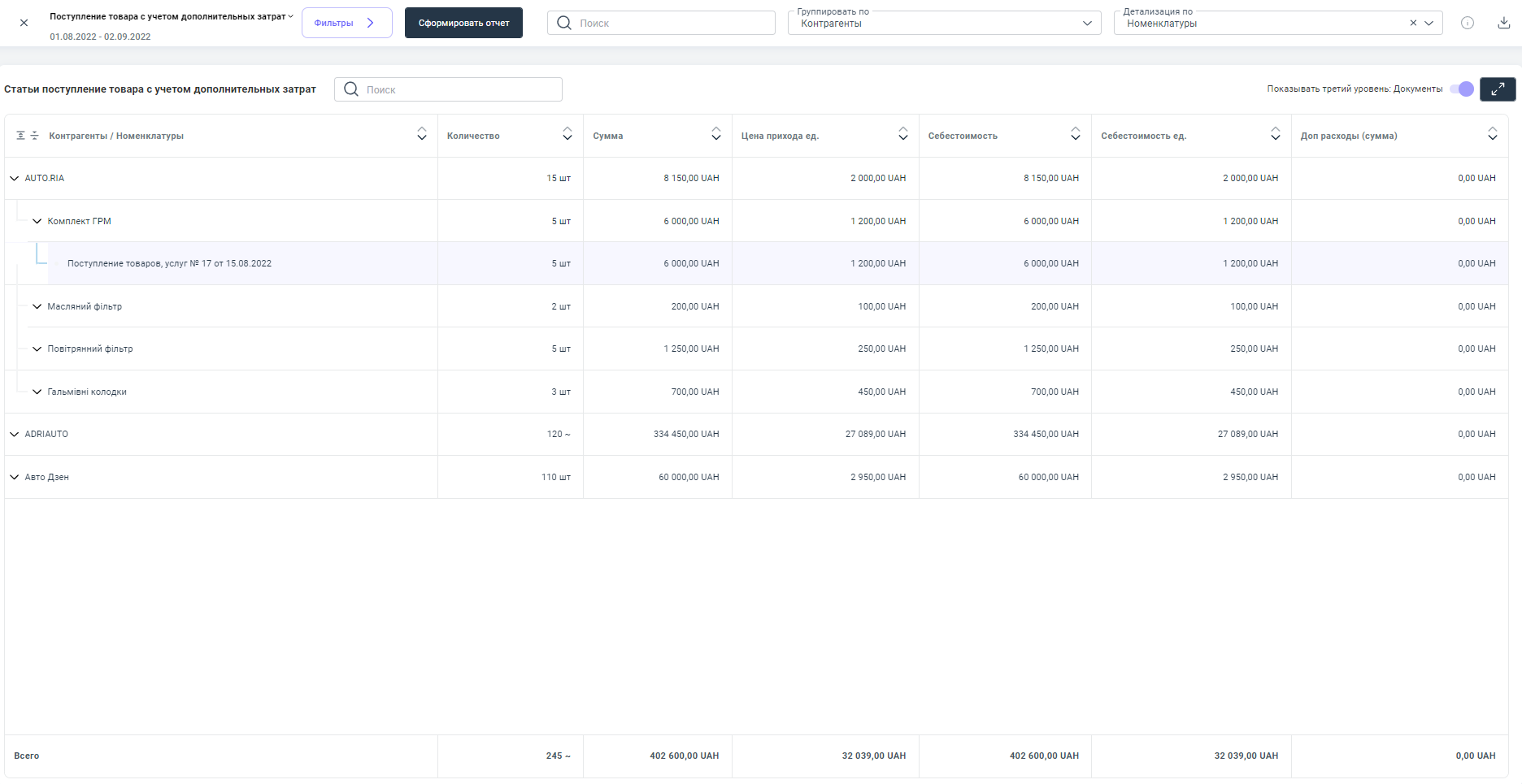 Пример наполненного информацией отчета "Поступление товара с учетом дополнительных затрат"⮭