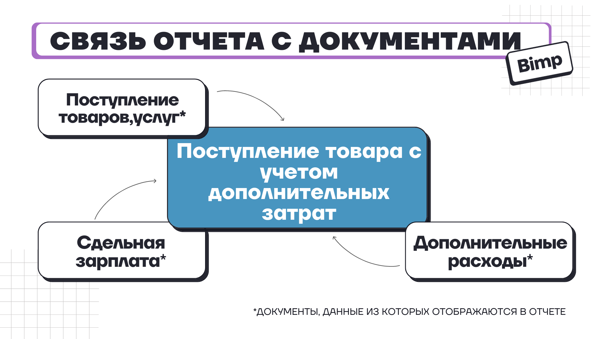 Отчет отображает - количество товара поступившего на склады компании; цену за единицу поступившего товара; сумму дополнительных расходов на поступление и себестоимость единицы товара уже с учетом дополнительных расходов.