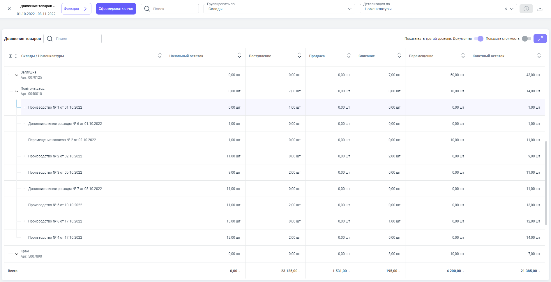 После создания документа "Производство, сборка" на основе спецификации, данные с этого документа попадают в отчет — Движение товаров.