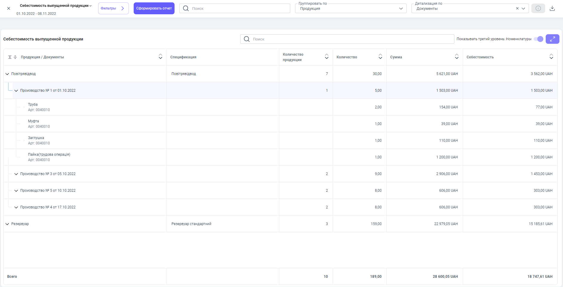 В отчете мы можем увидеть на основе какой спецификации был собран продукт, с какого количества составляющих, сумму и себестоимость каждого составляющего собранного продукта.
