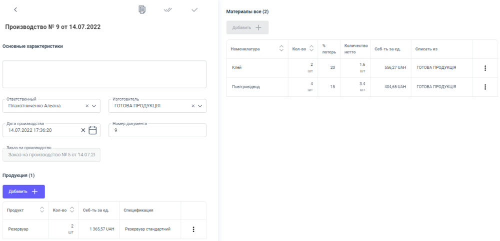 Детальнее о заполнении документа "Заказ на производство" читайте в статье: Создание документа "Заказ на производство"