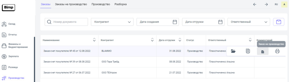 Для этого, необходимо создать документ "Производство, сборка" в блоке Производство раздел Производство нажав на кнопку "Создать", или с помощью панели виджетов нужного заказа, нажав на виджет "Производство, сборка".